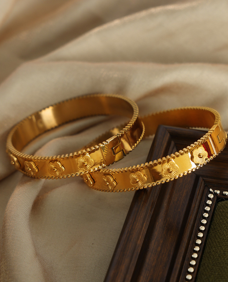 Elegant Design: This bangle bracelet features a sophisticated and elegant design with a series of finely detailed floral motifs. The bracelet is bordered on both sides with a delicate outlined texture, adding a refined touch. This timeless piece combines classic charm with modern style, making it a perfect accessory for any occasion