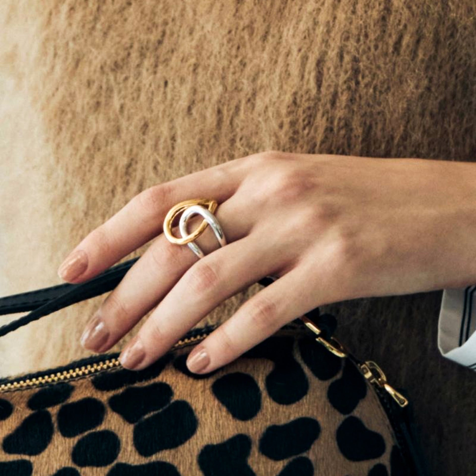 Elegant Design: This bold ring features a captivating two-tone design, seamlessly blending polished gold-plated and silver-toned bands. The unique, wide bands are intertwined to create a complex, interlocking shape. The high-polish finish on both metals catches the light beautifully, making it a modern and artistic statement piece. This dynamic and sculptural ring is a sophisticated and subtle accent, perfect for adding contemporary flair to any ensemble.